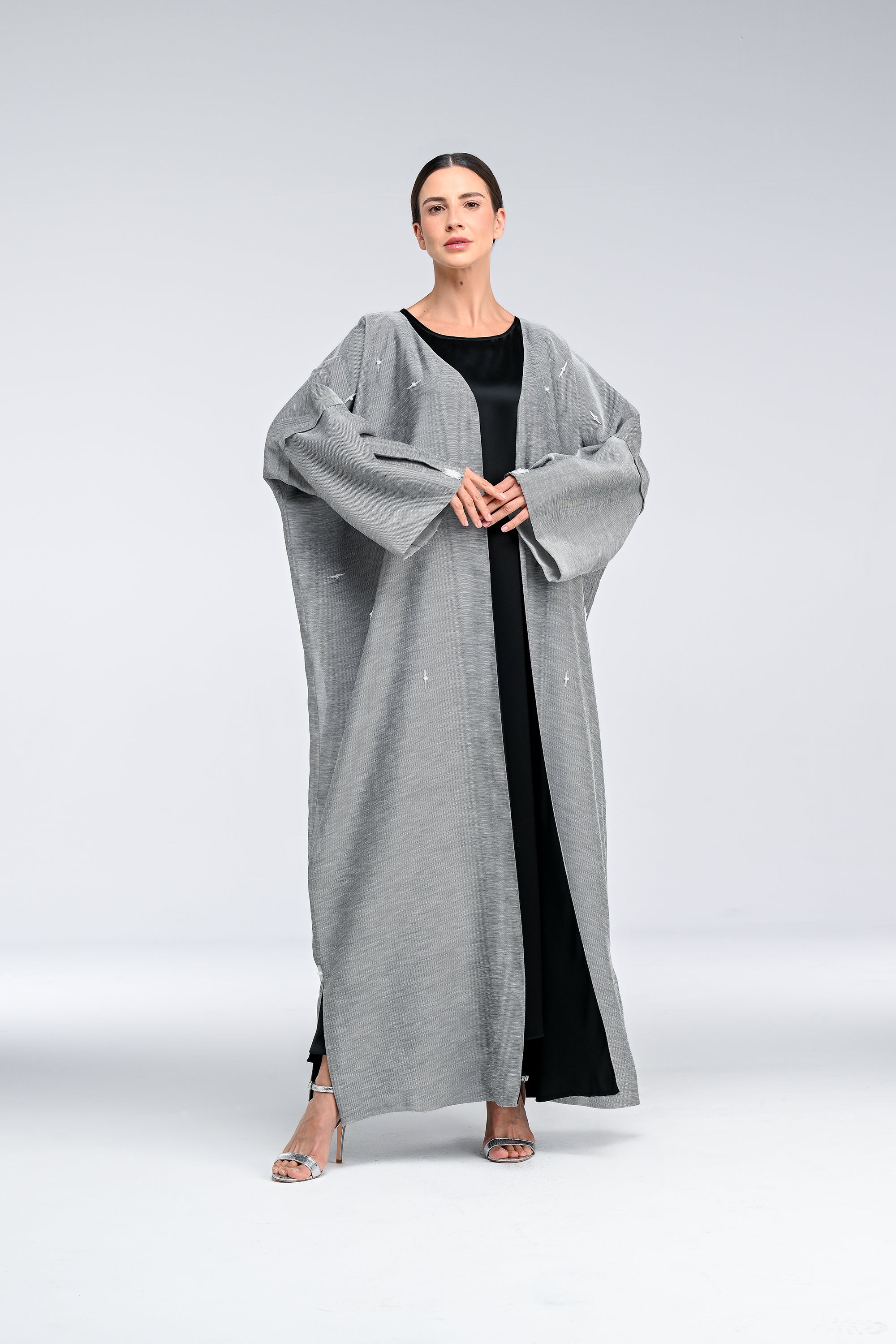 وفاءً لفلسفة «إيترو» في الفخامة الهادئة، تحتضن هذه العباءة القوام بقماش قطن رمادي مُطرَّز بخطوط بيضاء دقيقة كما لو كانت ضربات قلم على ورق فاخر. في الداخل، تضيف بطانة سوداء رقيقة حجباً كاملاً، مع تباين خفي يظهر عند الحركة. يأتي التصميم بلا ياقة ومفتوحاً من الأمام، ينساب من الكتفين حتى الحاشية بخفة لا تضاهى، بينما تمنح الشقوق العميقة حرية حركة طبيعية من مشاوير الصباح إلى مجالس المساء. تُفصَّل كل قطعة حسب الطلب وبأعداد محدودة، لتجسّد أناقة عصرية لا تضاهى.