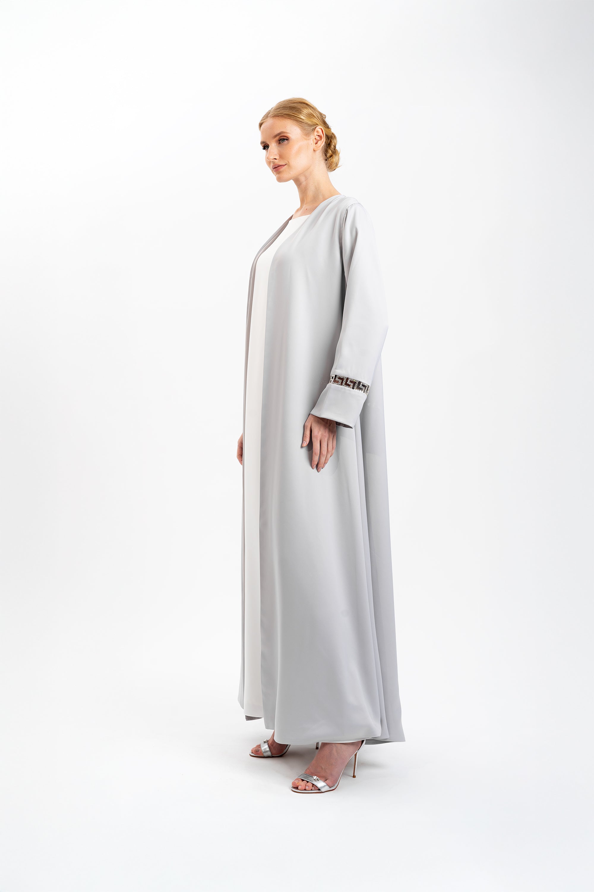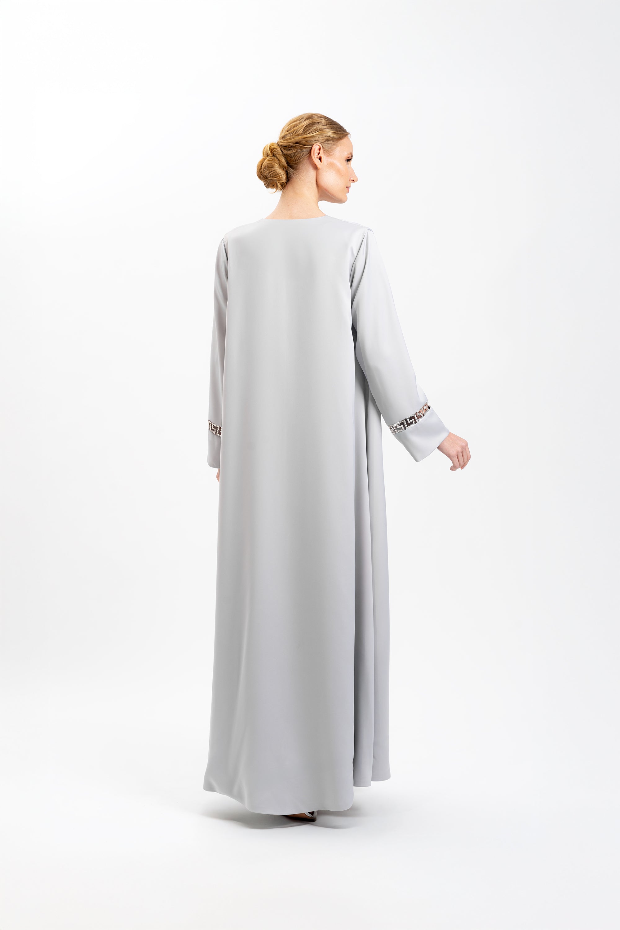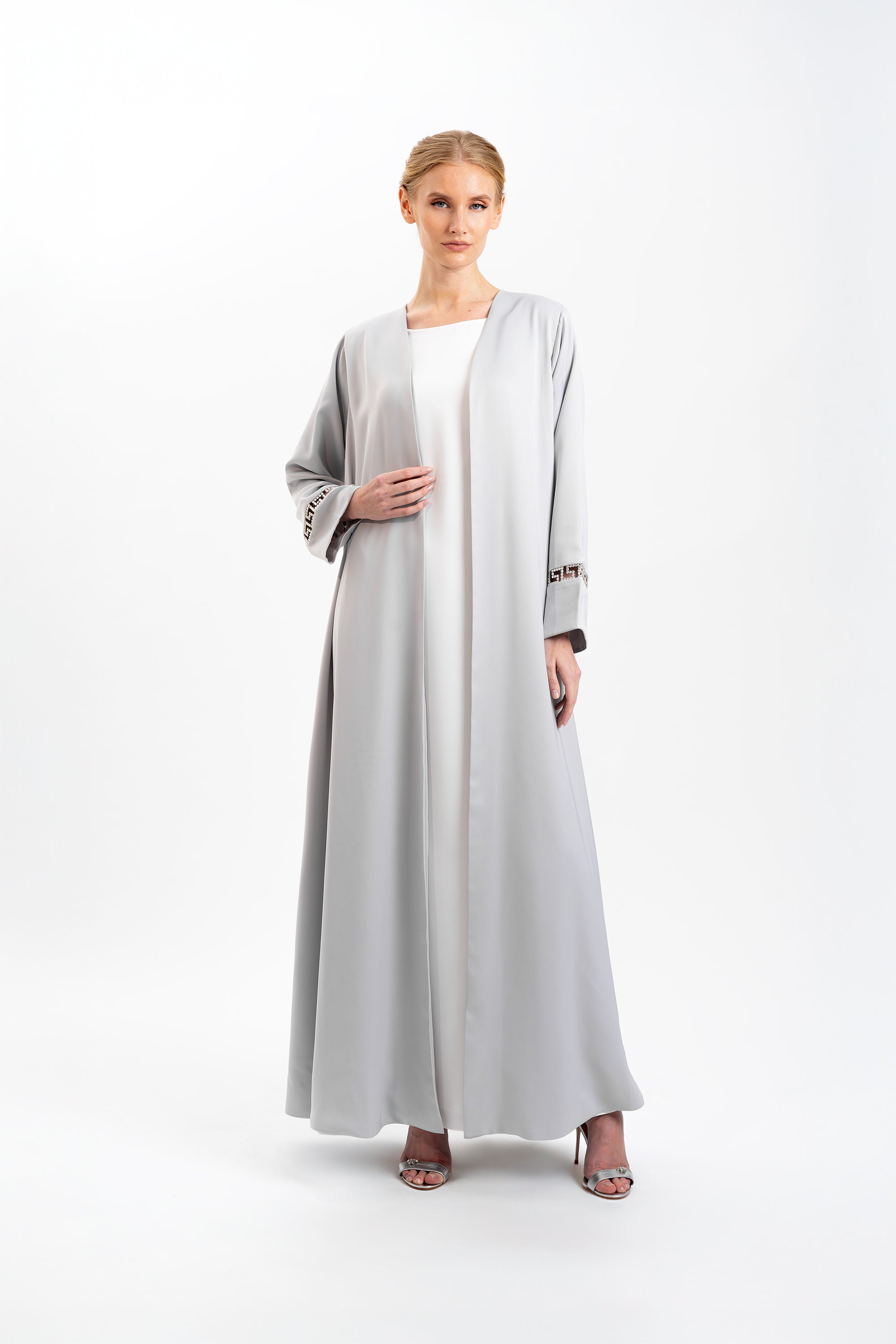 Channeling Ietro’s tradition of discreet opulence, this abaya drapes the figure in fluid ice-grey satin crepe with satin lining. At each cuff, peek-through windows trace a Greco-Roman key motif, their edges handset with clear Swarovski® crystals that flicker like morning light on marble columns. The collar-less, open-front A-line silhouette glides from shoulder to hem, marrying architectural poise with weightless motion. Crafted to order in limited numbers, every piece is refined to your exact measurements by our atelier stylist and dispatched within four weeks an heirloom of modern Arabian elegance.