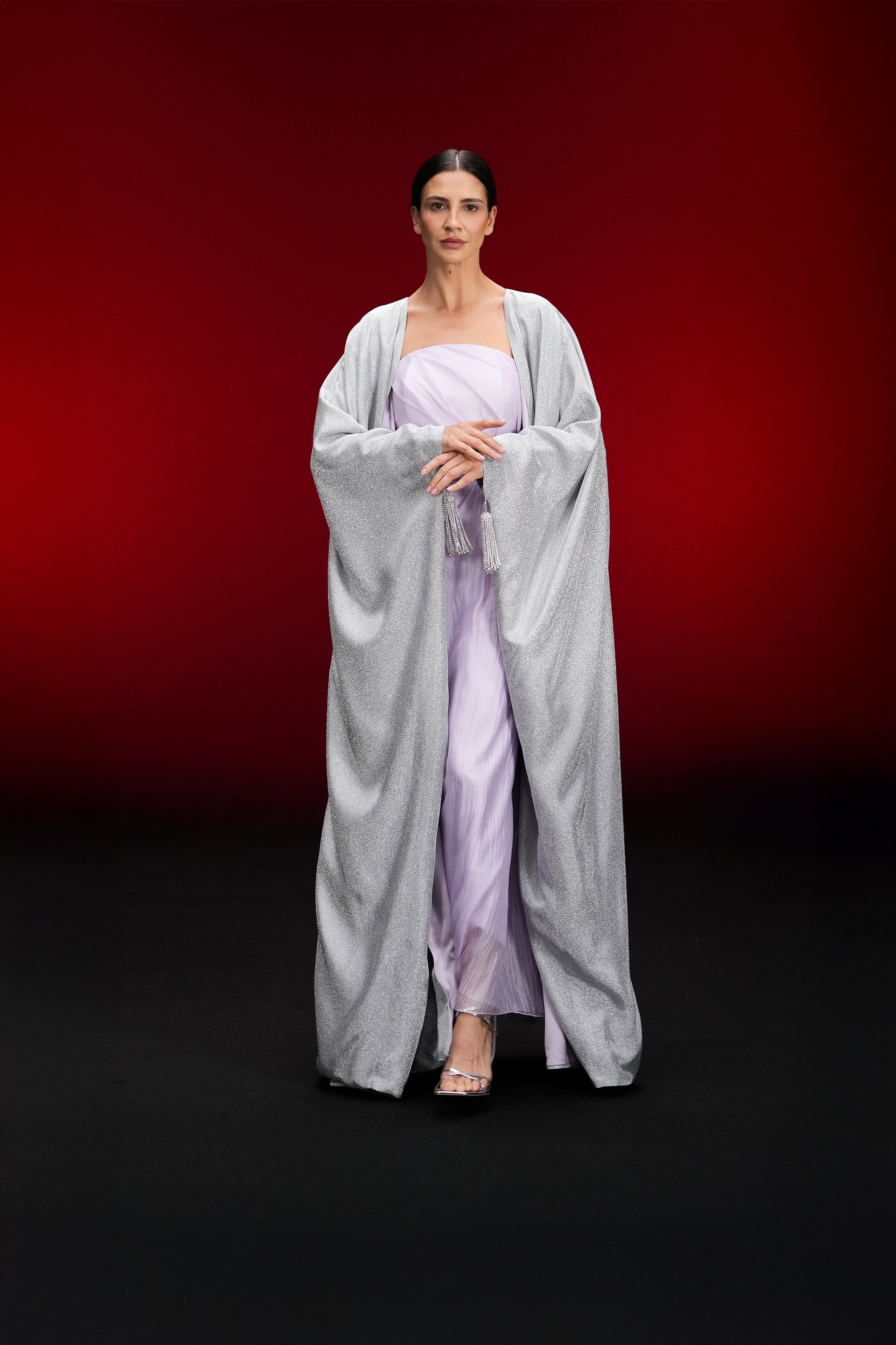 وفاءً لإرث «إيترو» في الفخامة الهادئة، تلتف هذه العباءة حول القوام بنسيج شبكي فضّي إيطالي متلألئ، تعكس خيوطه المعدنية بريق الضوء مع كل حركة. في الداخل، تضفي بطانة طبيعية من حرير بنفسجي نقي برودةً وانسيابيةً حريريةً تهمس بلونٍ خفي لا يراه إلا من ترتديه. وعلى كل كفّ، تتدلى طرابيش تتلألأ كثلوج معلّقة عند الغسق كريستالية قابلة للفصل، صُنعت يدوياً لإيترو في إيطاليا