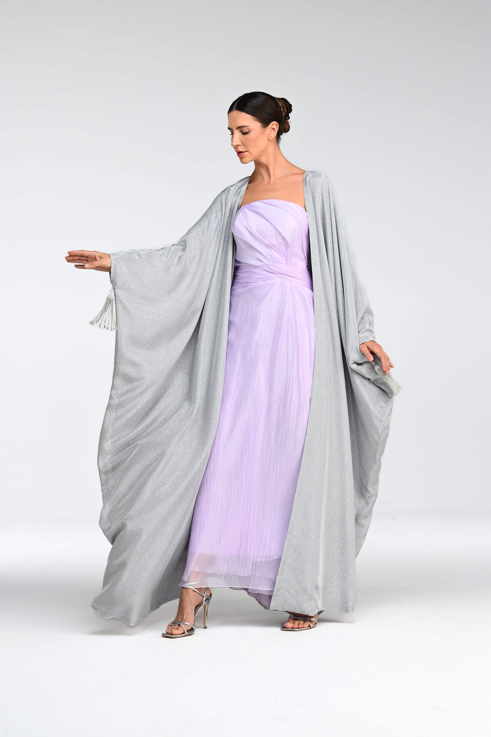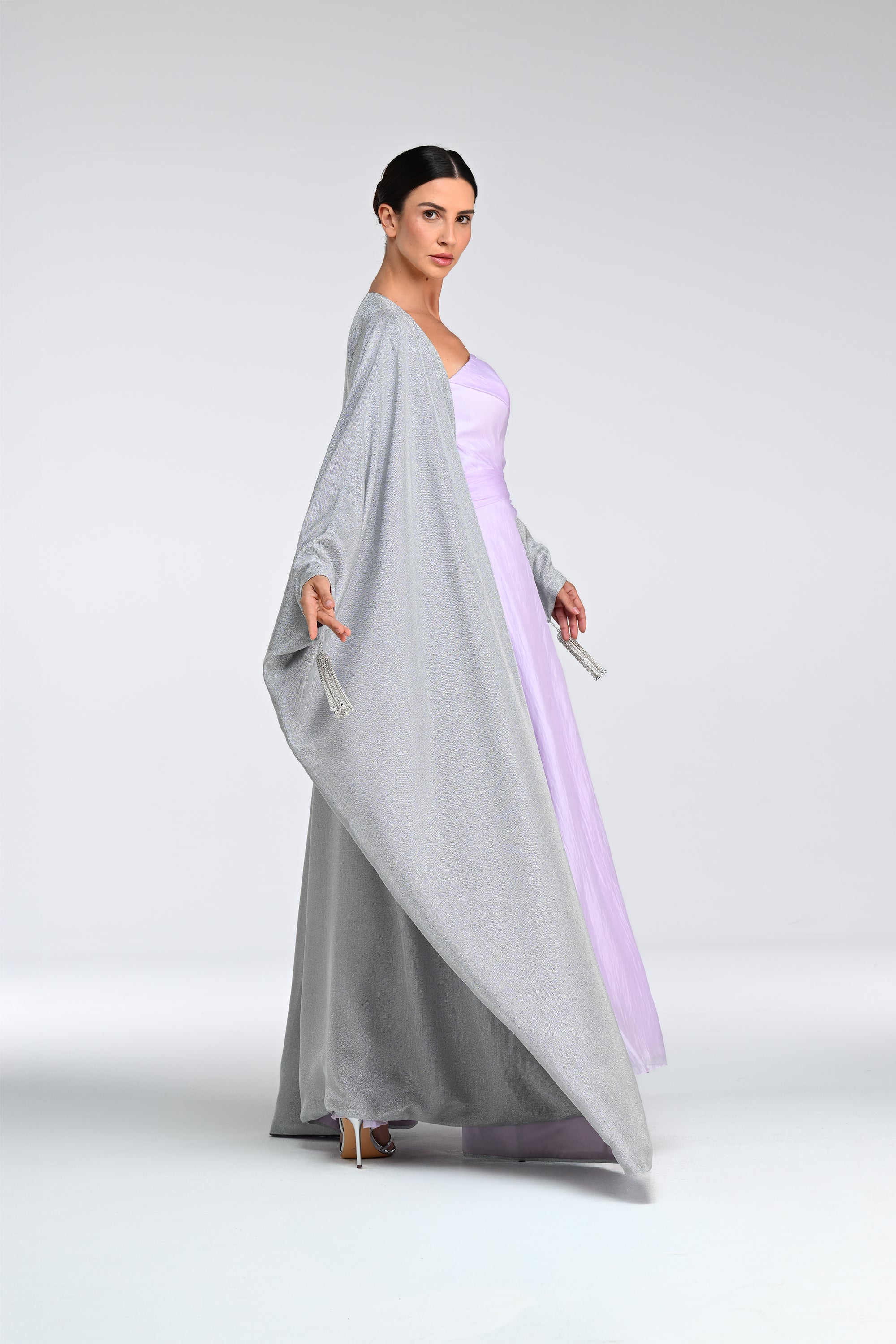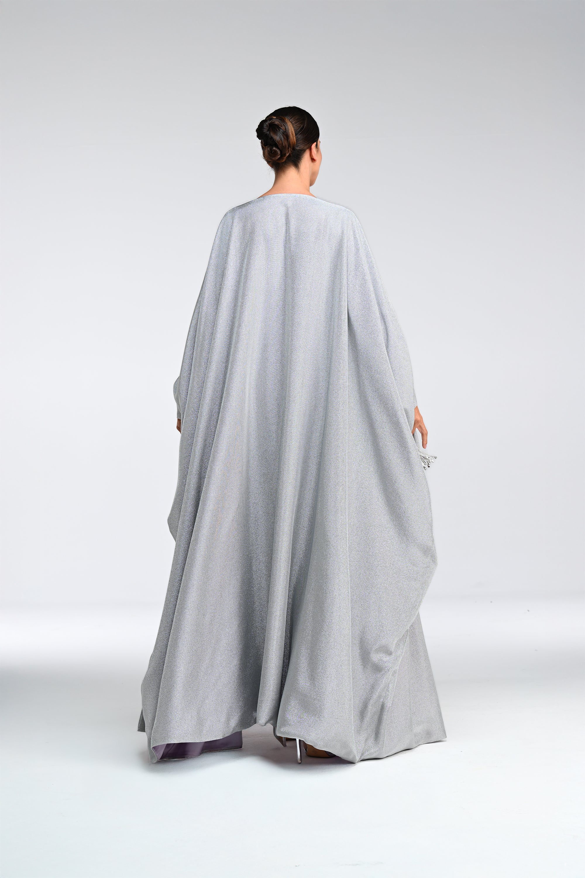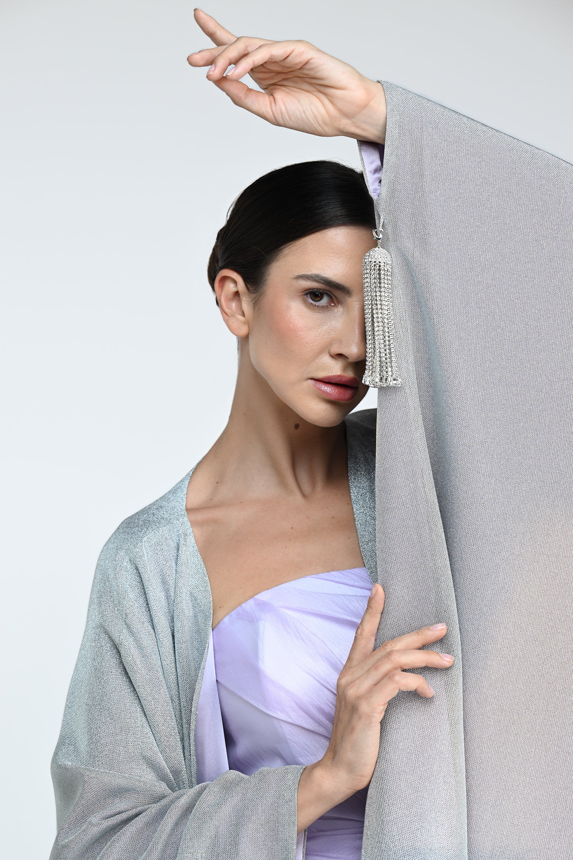 Honoring Ietro’s tradition of restrained opulence, this abaya envelops the figure in shimmering Italian silver-weave mesh, its metallic threads catching every ripple of light. Inside, a lining of pure lavender silk imparts cool, liquid movement and a secret wash of color known only to the wearer. At each cuff, detachable crystal tassels custom-made exclusively in Italy sway like icicles at twilight, lending audible sparkle with every gesture.