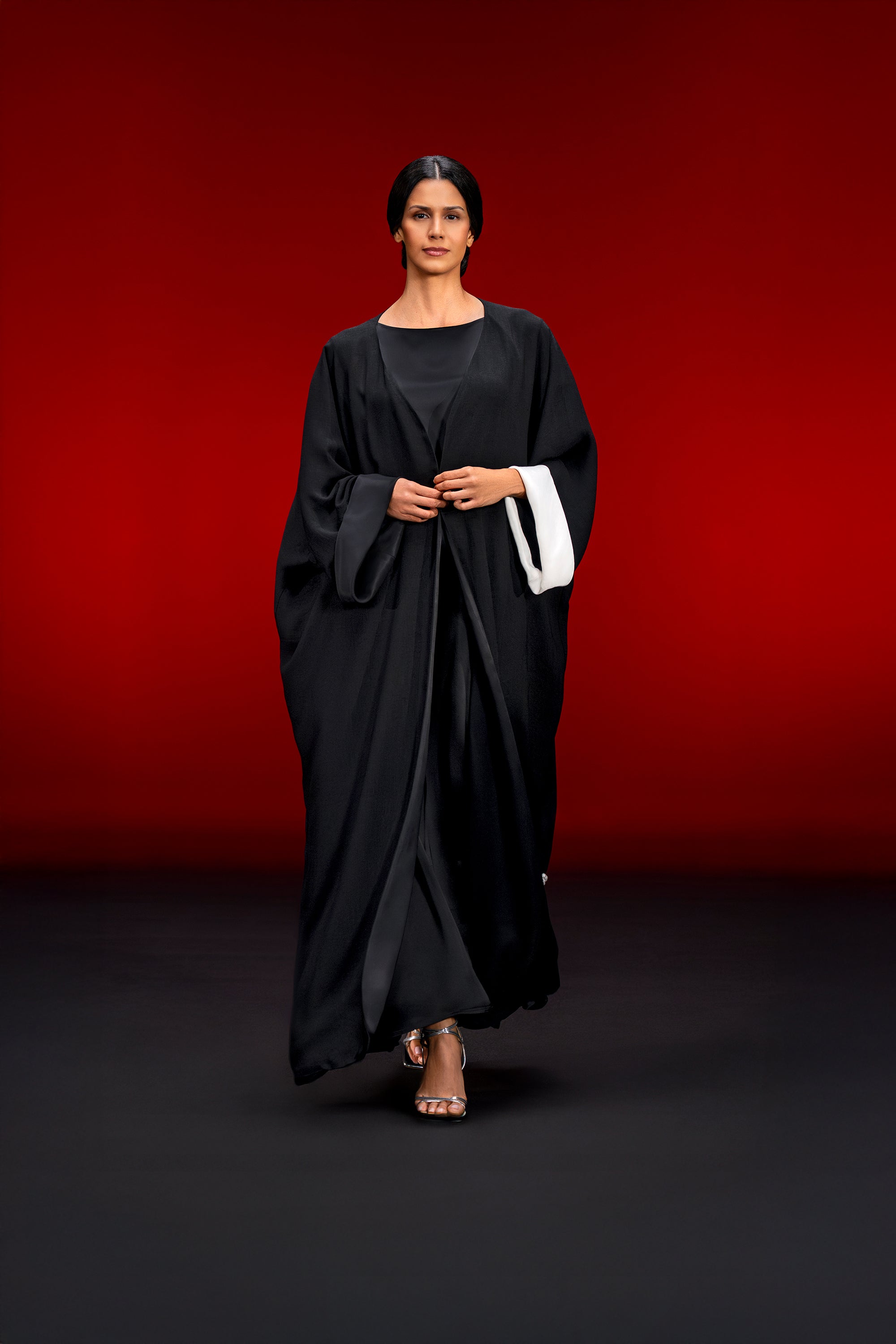 انطلاقاً من فلسفة «إيترو» في الفخامة الهادئة، تنسدل هذه العباءة من كتفك بقماش كتان أسود قابل للتنفس مع بطانة سوداء رقيقة من قماش الساتان، فيما يزيّن الكم الأيسر كفّ أبيض ناعم يضفي لمسة عدم تماثل تخطف الأنظار. عند الحاشية، يلمع  صدف من اللآلئ مع كل خطوة، محوِّلاً البساطة إلى عرض هادئ للجمال. تُفصَّل كل قطعة حسب الطلب في مشغلنا، وتُضبط مقاساتها بدقة، ثم تُشحن خلال أربعة أسابيع تحفة تراثية بطابع معاصر.