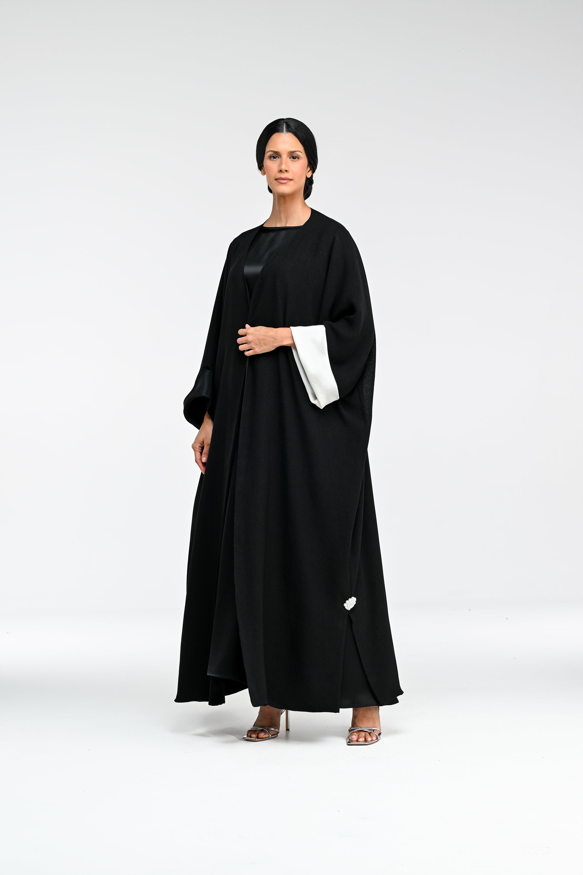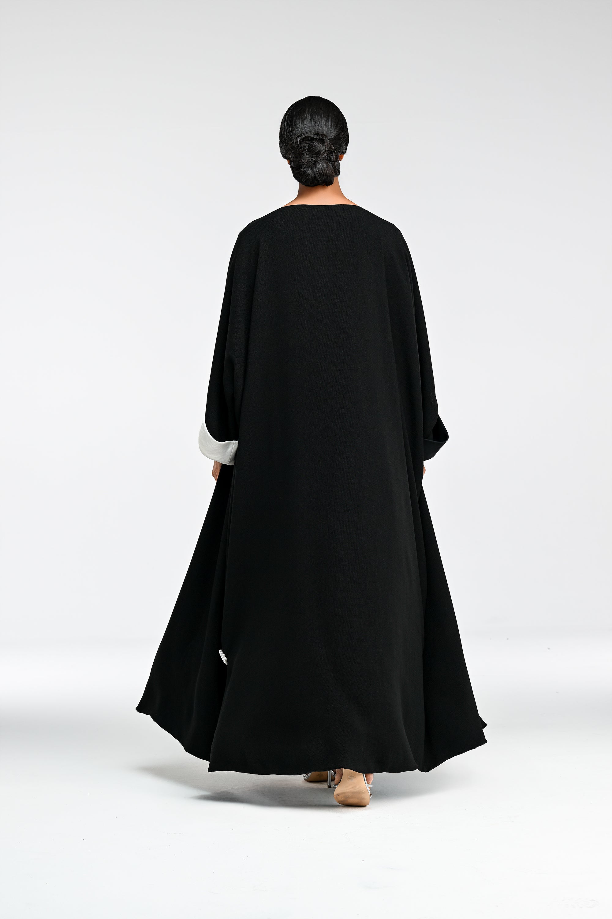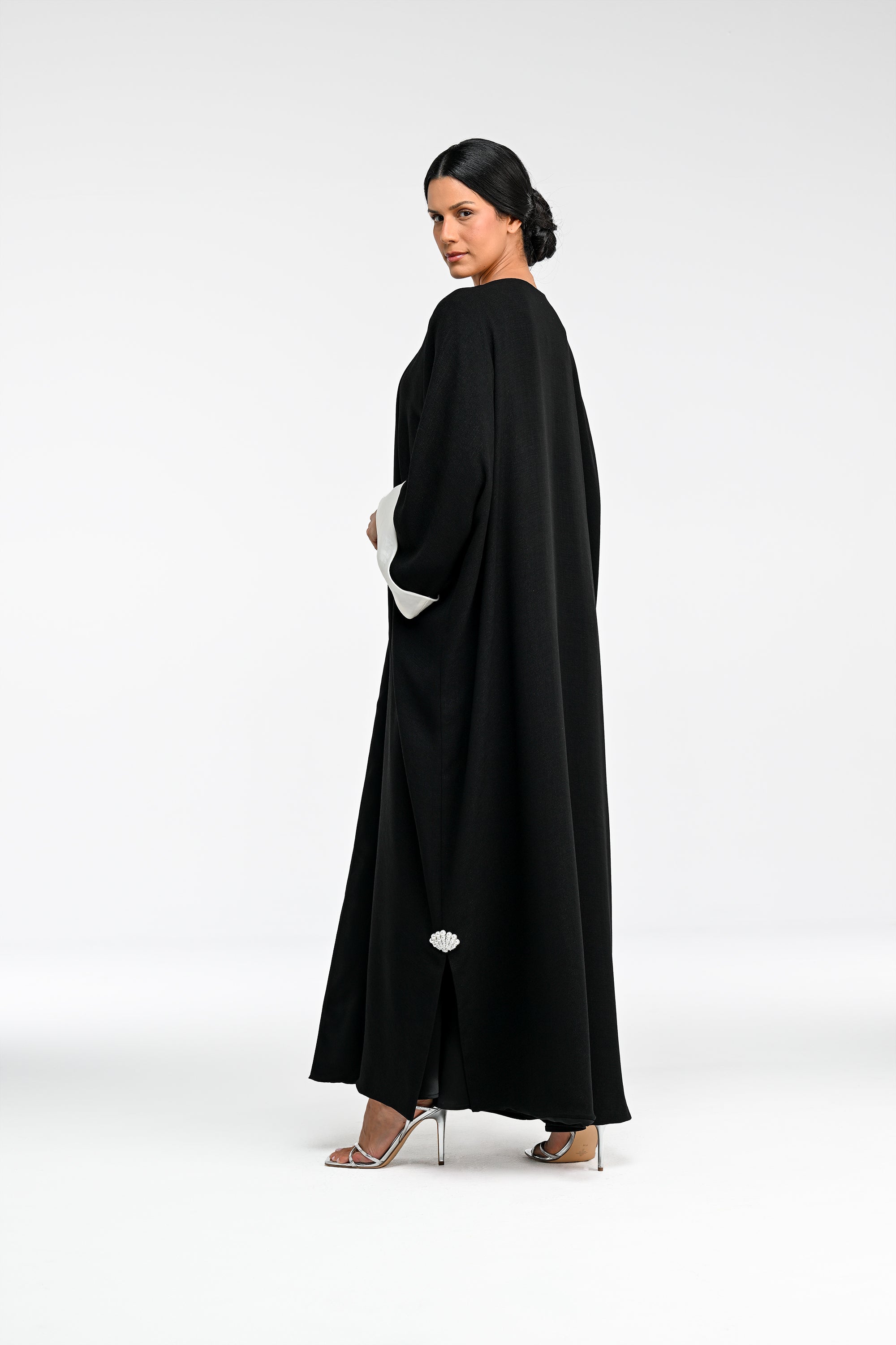 Rooted in Ietro’s philosophy of discreet opulence, this abaya drapes the figure in breathable black linen and a jet-black satan lining, while a single soft-white cuff on the left sleeve delivers a striking, asymmetric accent. Near the hem, a pearl “seashell” bijoux glimmers with every step, an unexpected flourish that turns simplicity into quiet spectacle. Each piece is cut to order in our atelier, refined to your exact measurements by a dedicated stylist, and dispatched within four weeks an heirloom of modern grace.